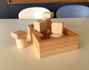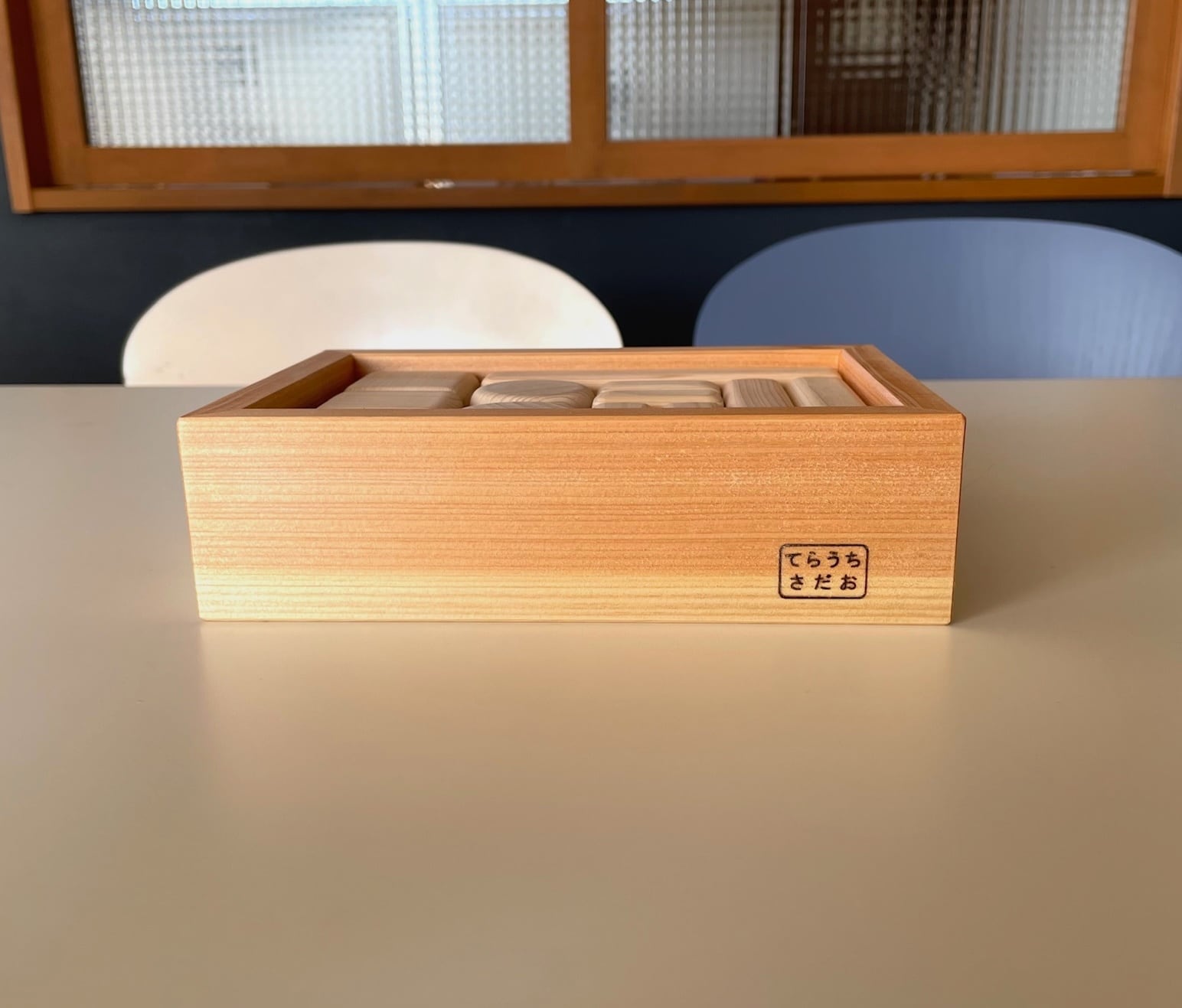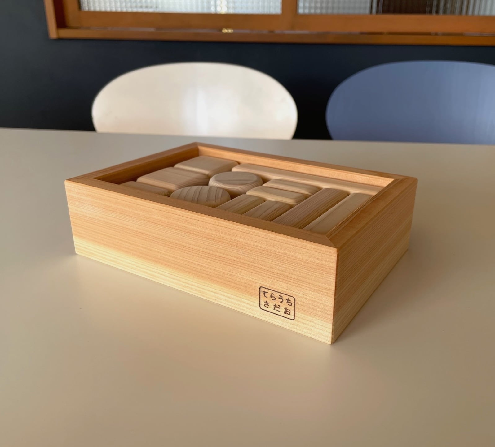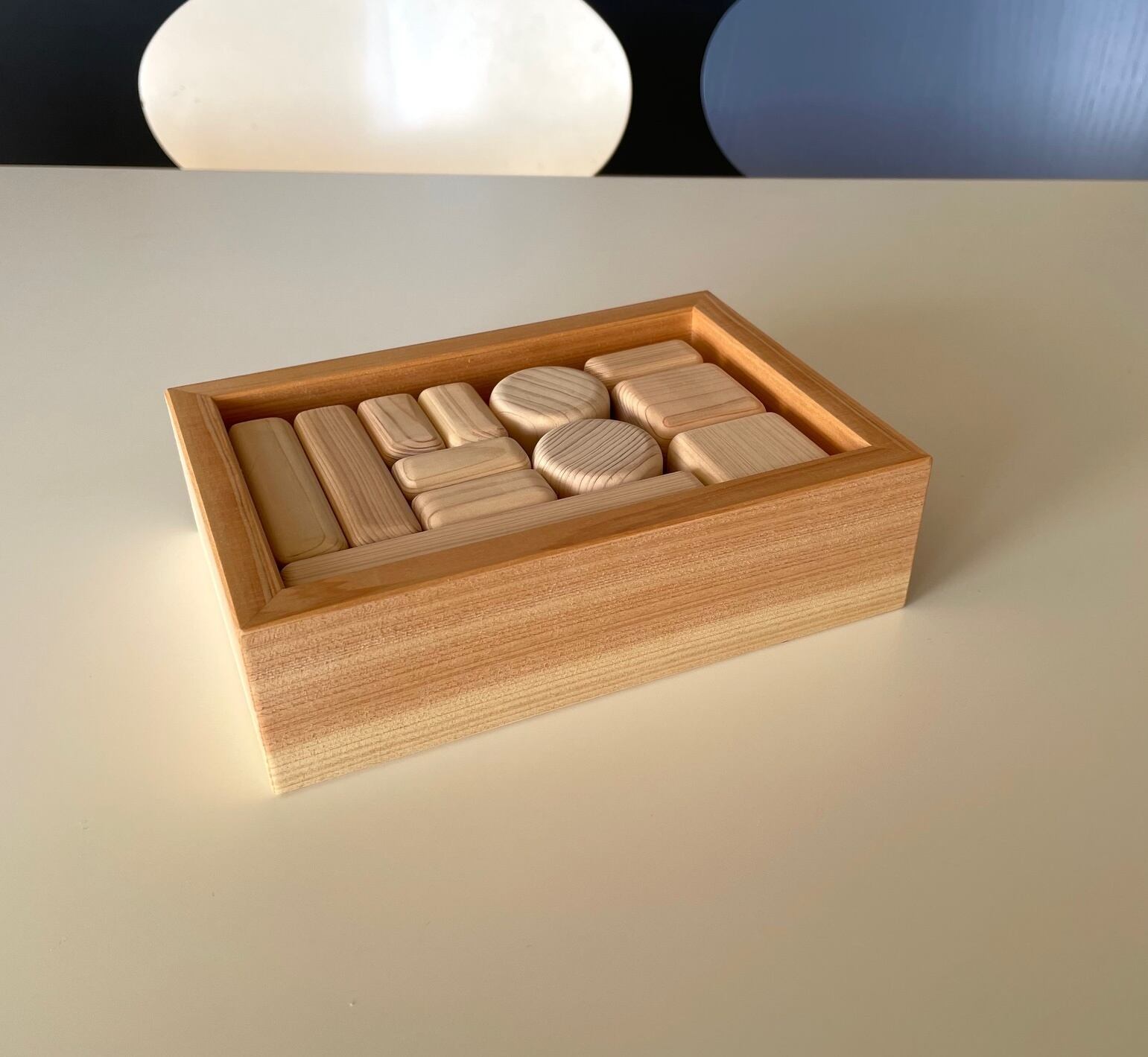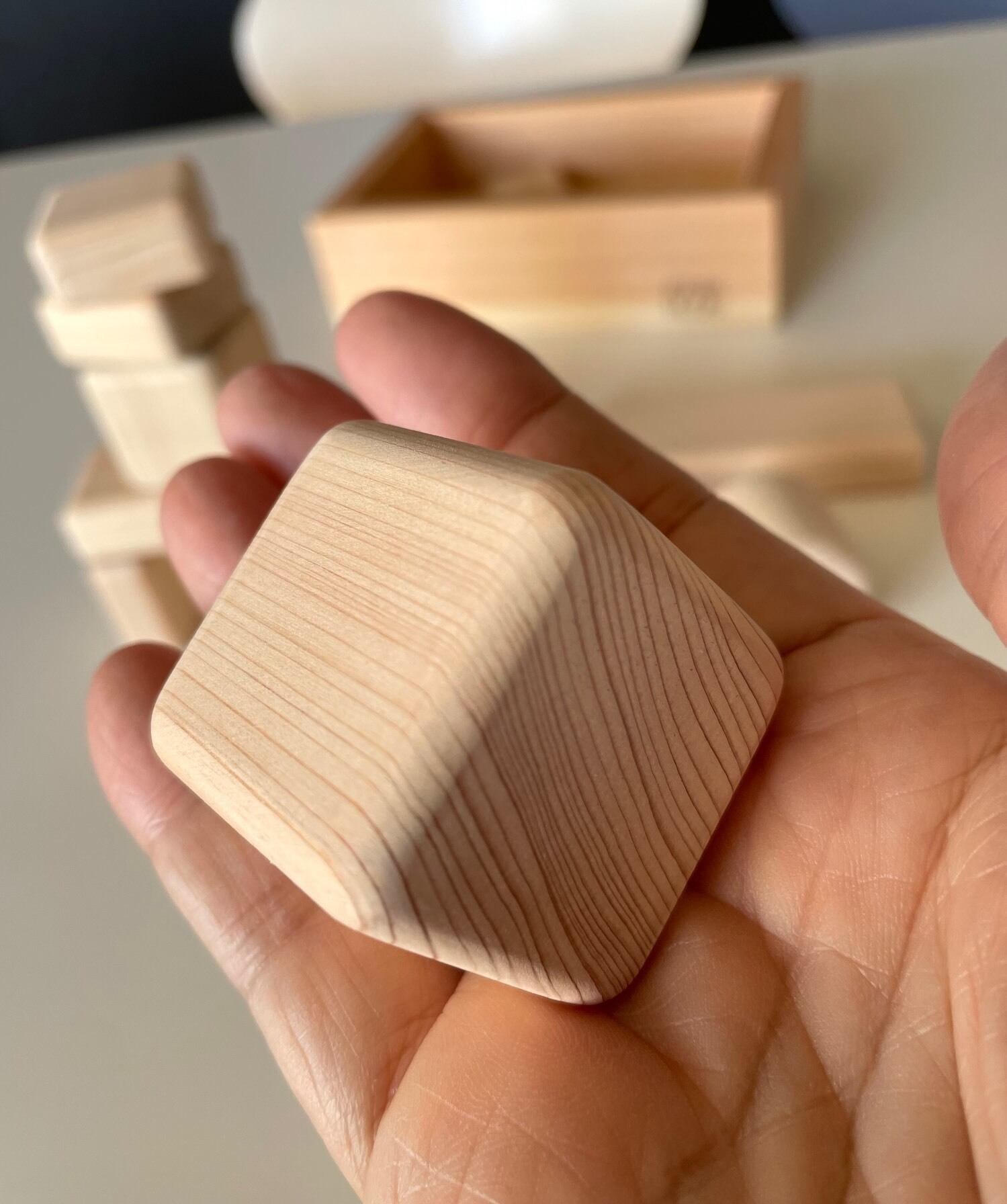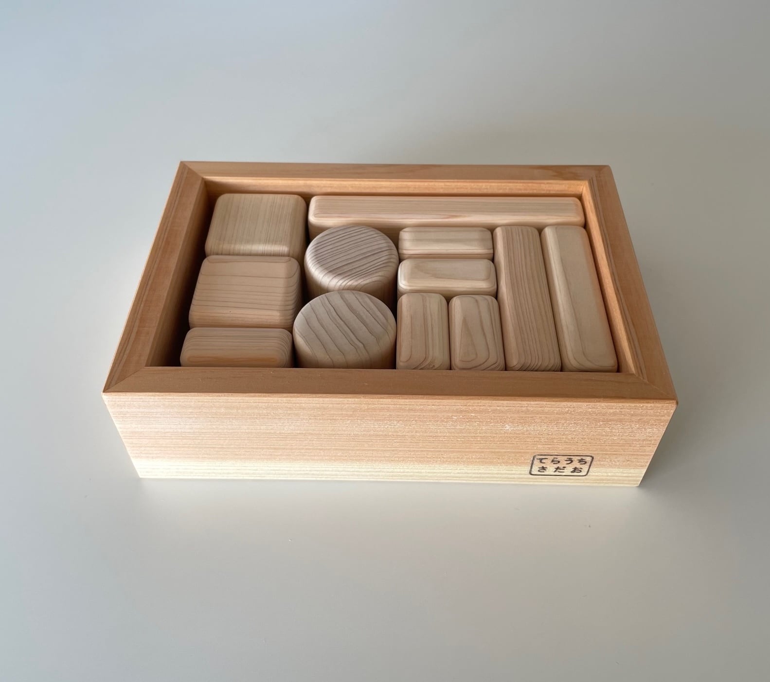 日本有数のブランド檜、諸戸百年檜のあかちゃんつみきを、やはりブランド材の木曽檜の木箱に納めました。