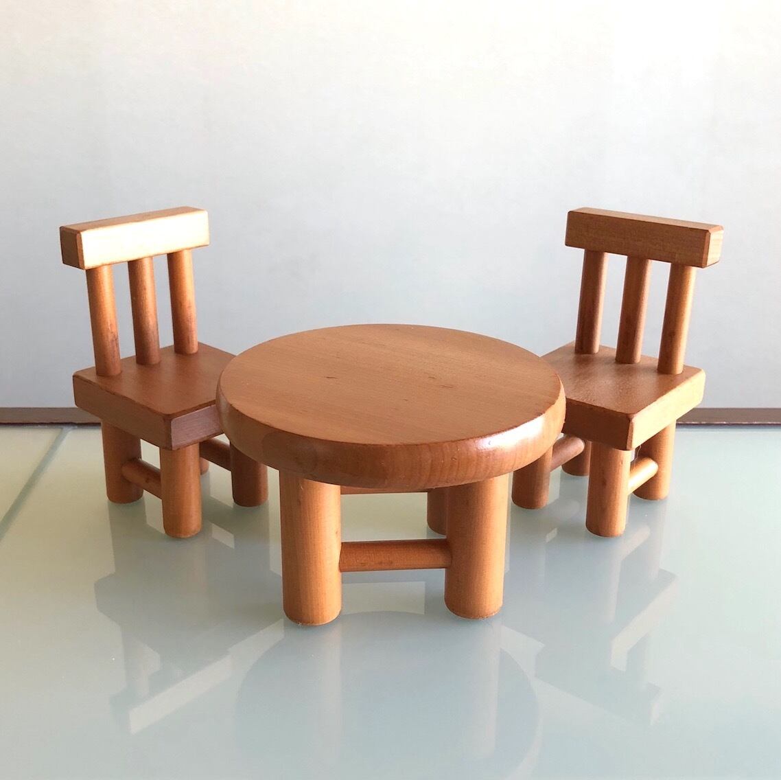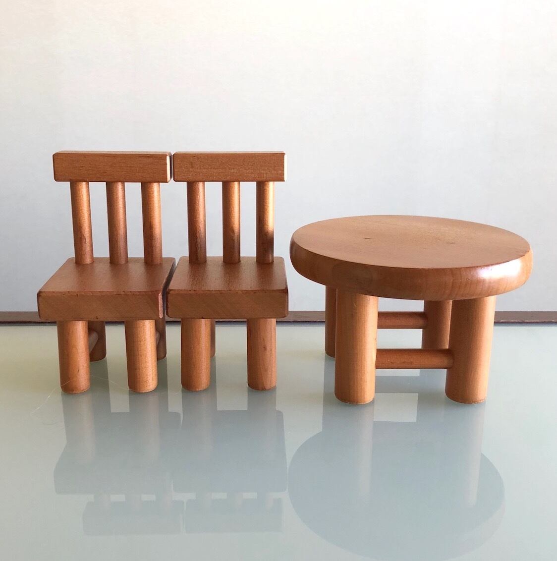 人気のある「イスと丸テーブル」を可愛らしいサイズにした「ごっこのイスと丸テーブル」の展示品です。