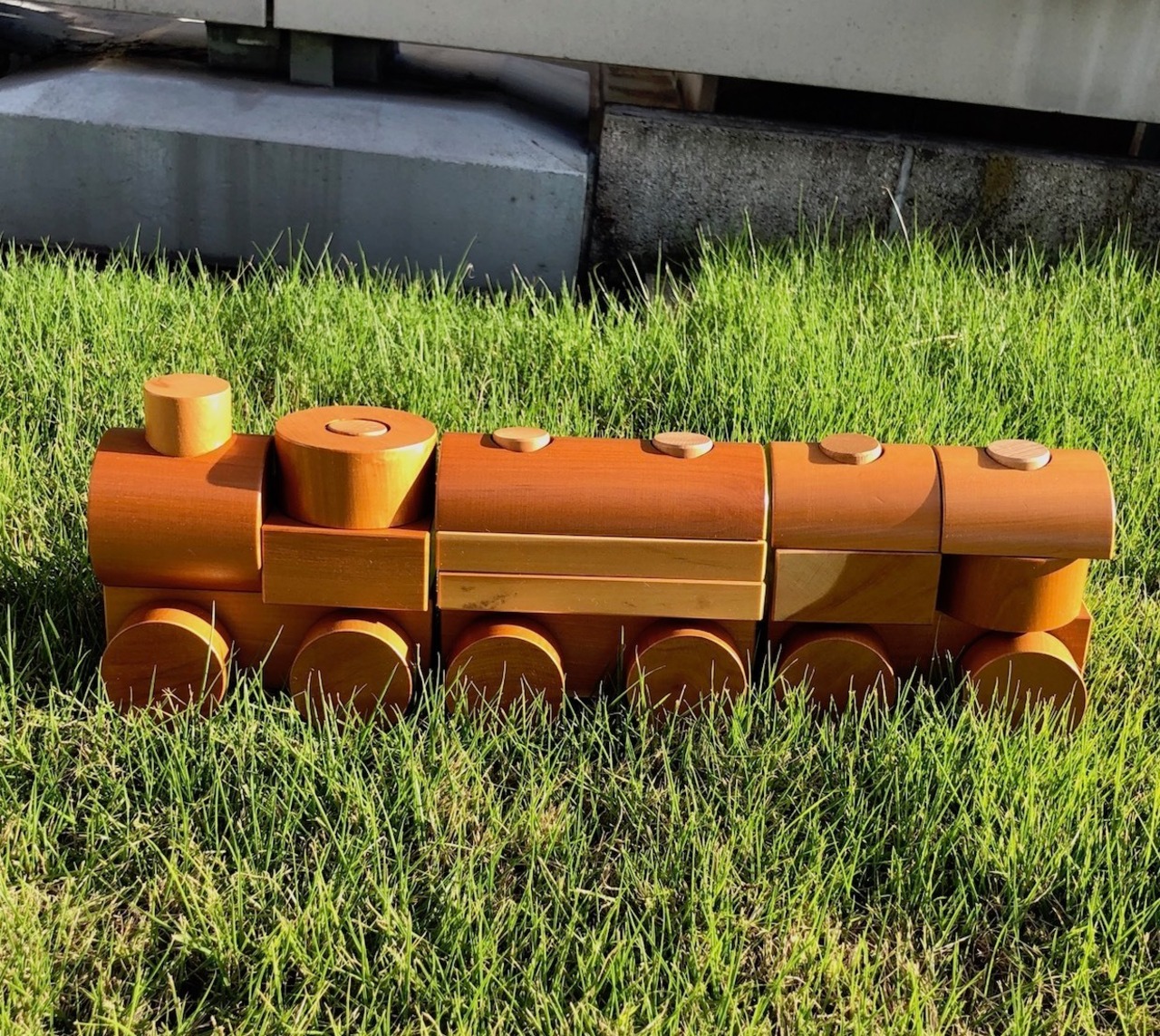 最後の写真の、同じ価格で売り出し中の20年ほど前の汽車つみきと縦に並べた写真を参考にしてください。