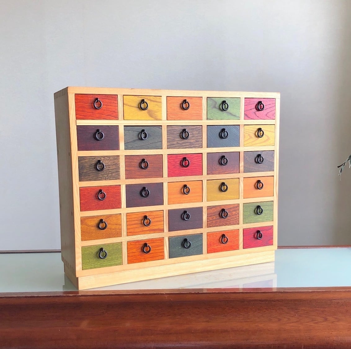 国産センの木、彩色部分は水性ステイン着色(染色)塗装、全体は薄めのクリアラッカー塗装仕上げ。