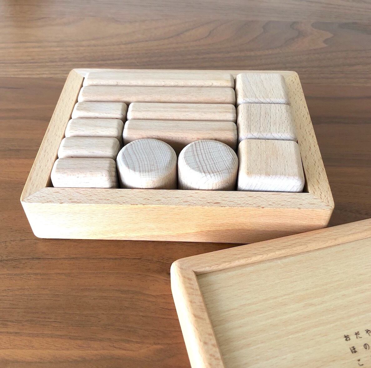 蓋つきのお弁当箱のような木箱に13個のパーツを収めた、ブナのあかちゃんつみきです。