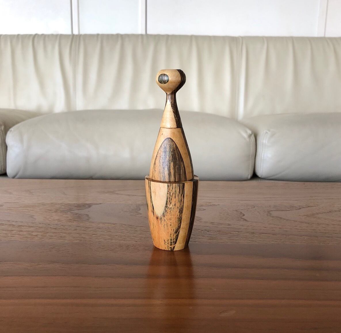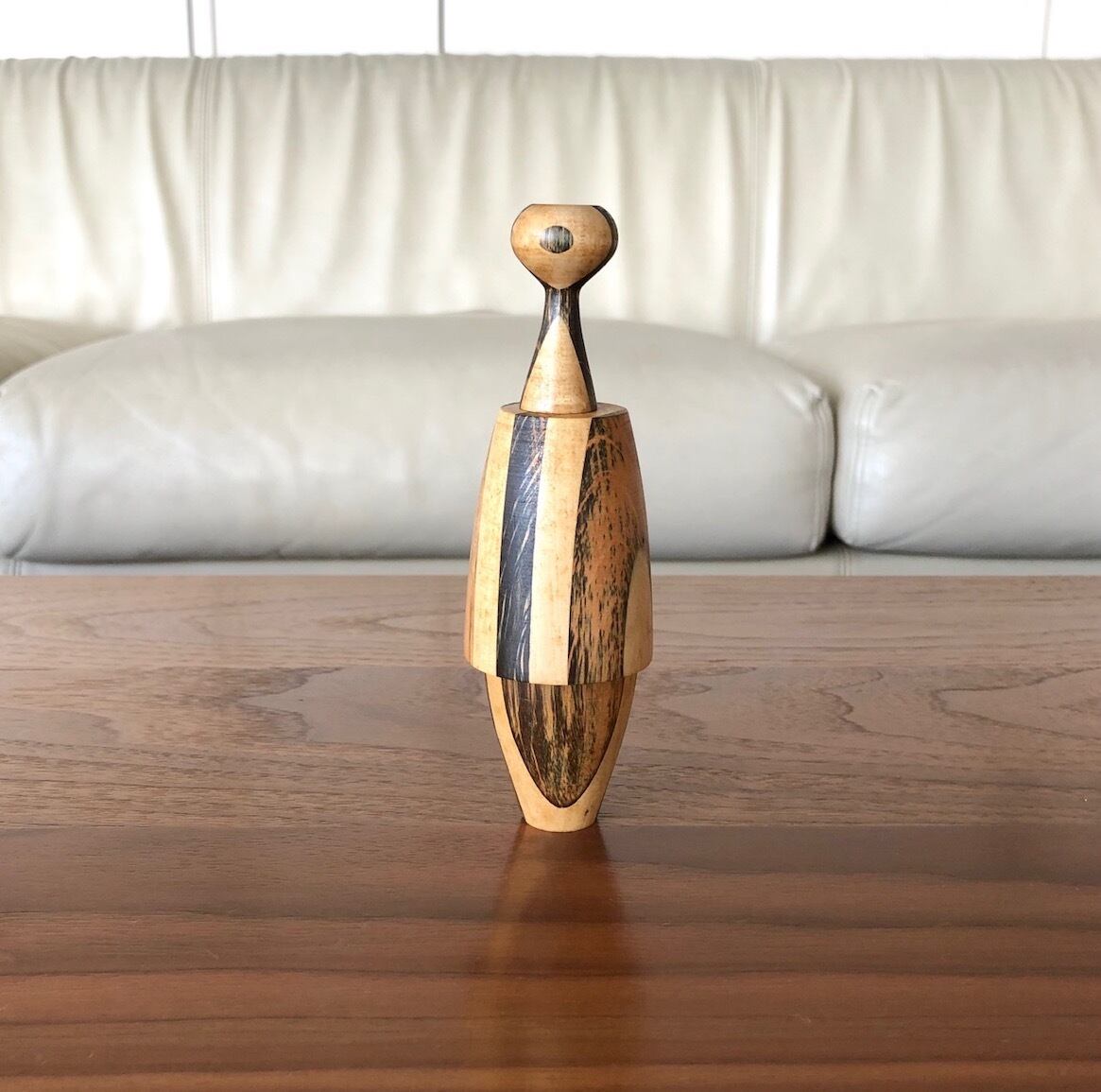 この、小田原の寄木細工で作ったこのつみこけしは、50年近くが経過していますが、デザインだけではなく経年によってヴィンテージの風合いも増して立派なアート作品になっています。