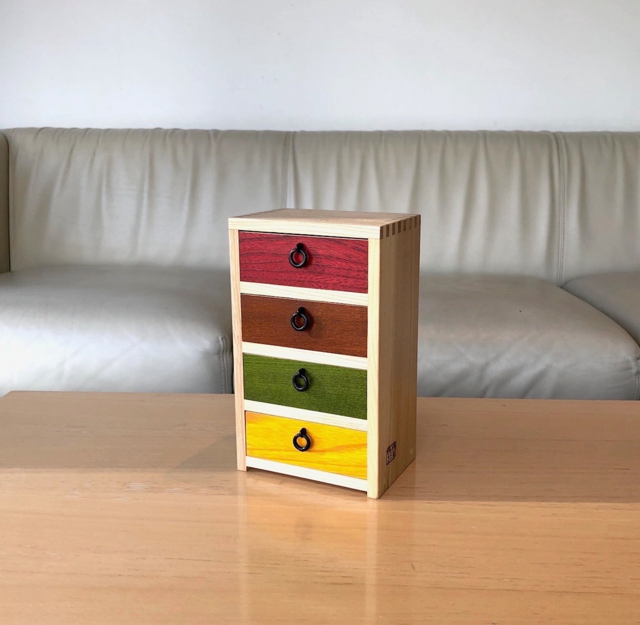 寺内定夫の「ひきだし」シリーズの中でもっとも小さな、4つのひきだしがある可愛らしい収納家具おもちゃです。