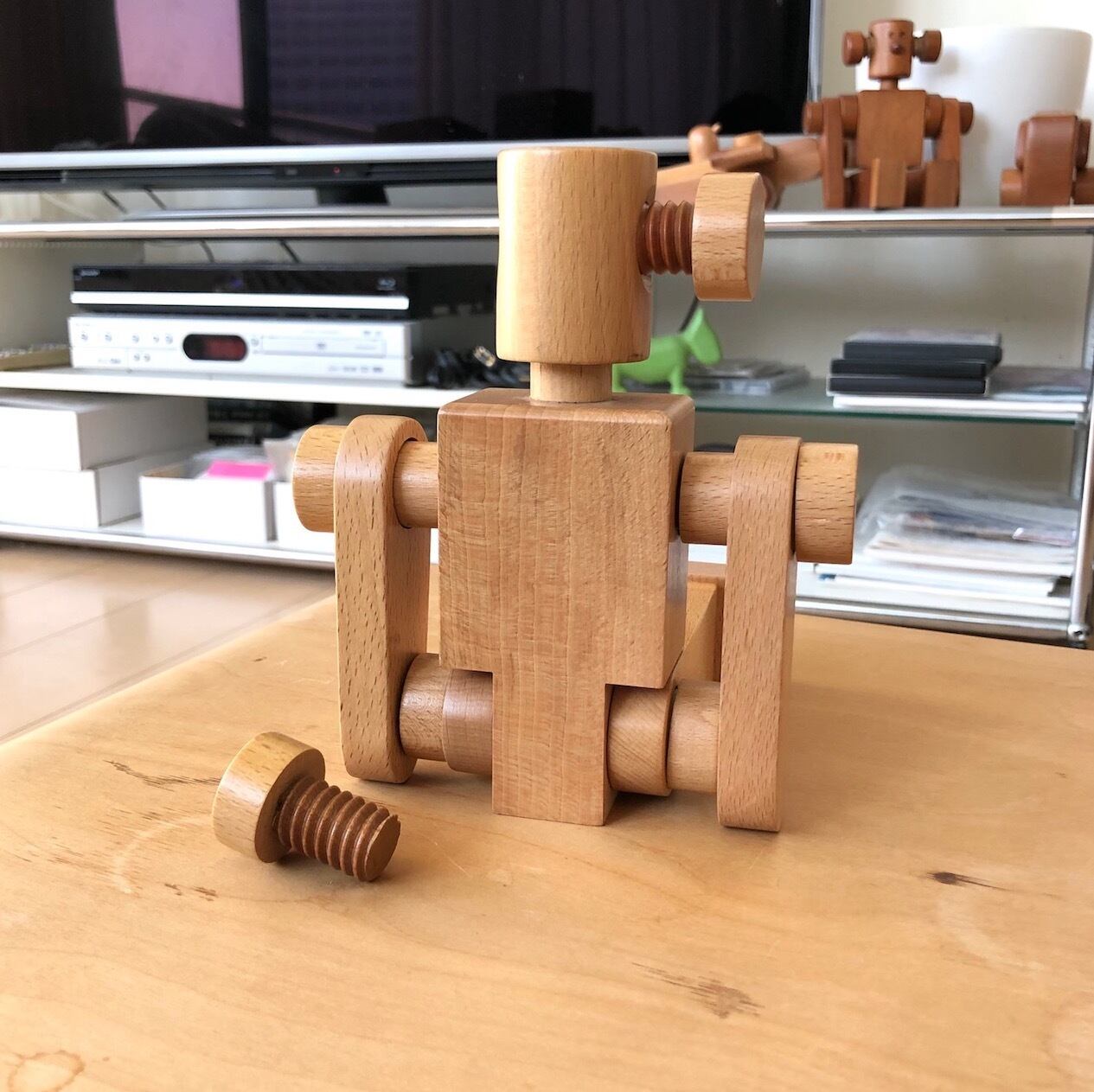 今は貴重な国産のぶな材にクリアラッカー塗装を施し、両足の裏に刻印のある旧タイプのロボット君です。