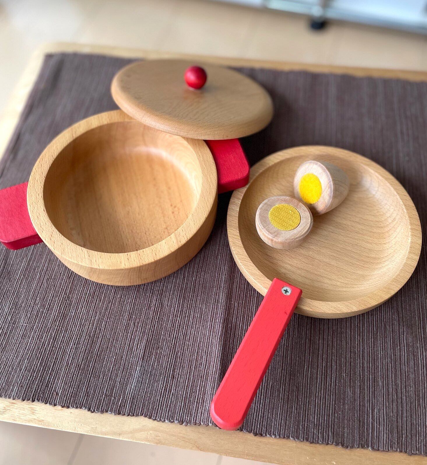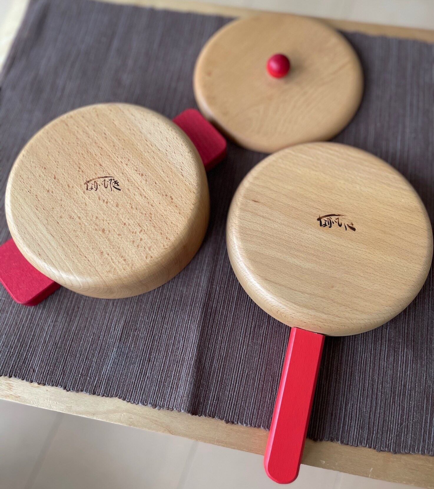 中井さんで有名なのはカットベジタブルですが、このお鍋とフライパンもぶなの木を美しく仕上げ、取っ手の赤い塗装がアクセントになり可愛い作品です。