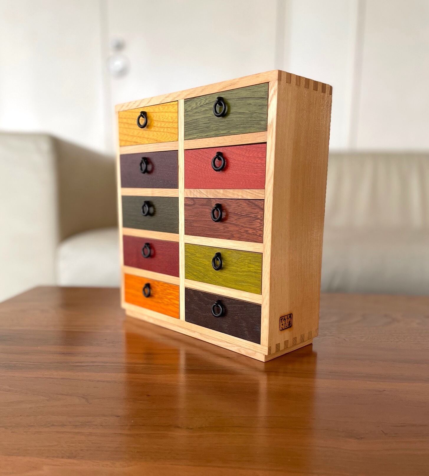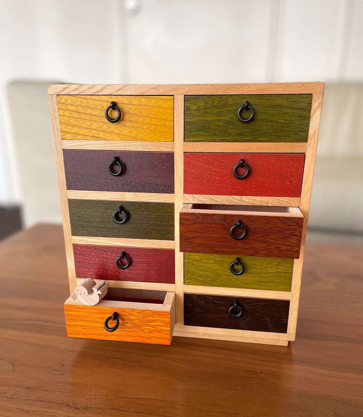 ひきだしの前板の彩色は、寺内定夫を始め、家族で試行錯誤しながら染色の技法で何度も重ね塗りして染めています。