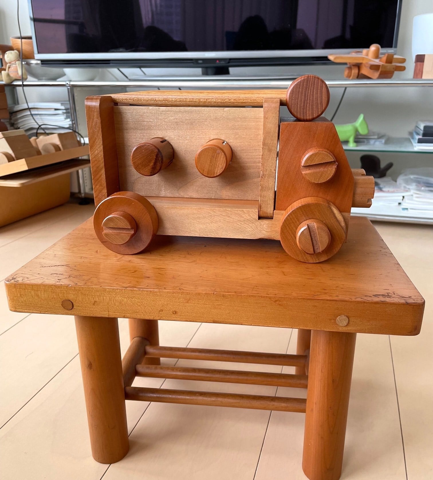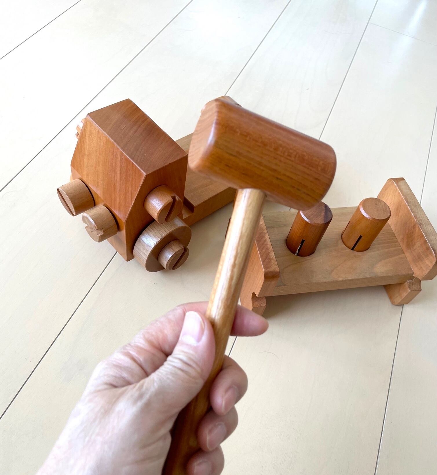 木のネジをくるくる回して分解したり組み立てたりできるおもちゃをいくつか制作し、このトンカチぐるまもそのひとつです。