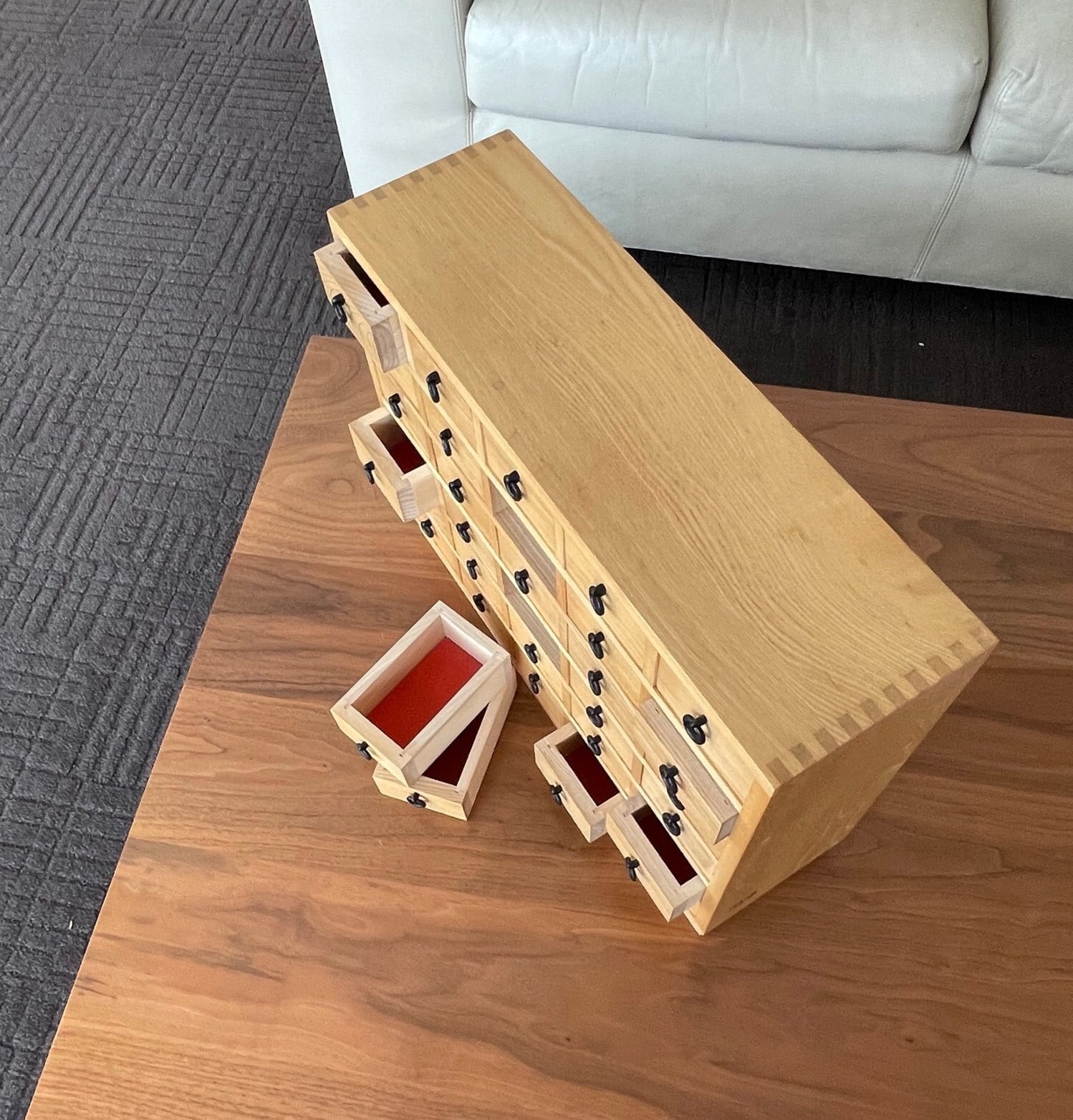 30個の小さなひきだしのどれかに、コレクションしている古いボタンや写真のてのひらチャームを入れてお届けします(写真のカバは付きません)。