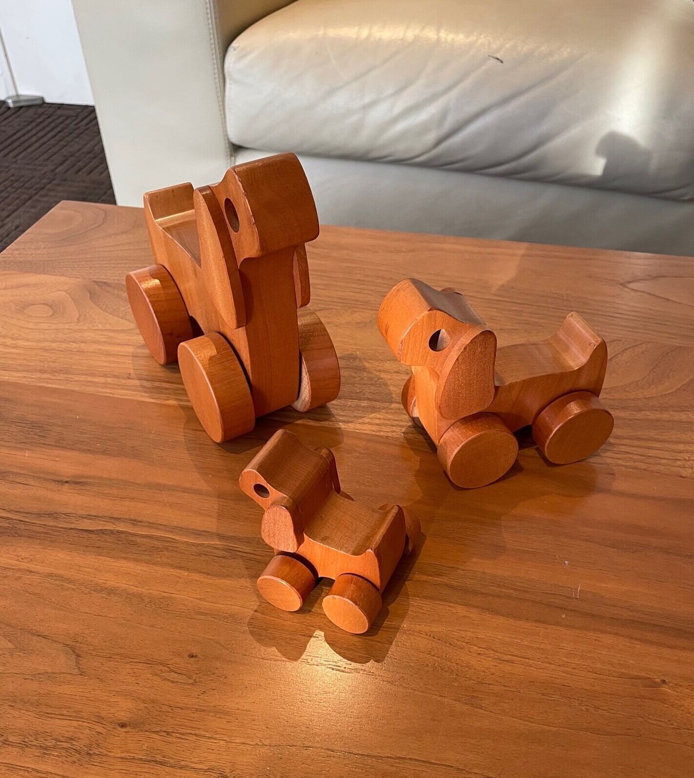 あまり遊んだ形跡はなく、一応中古品ですが保管の際のキズが多少ある程度で、エイジングしたカツラの木の木目も美しく、インテリアトイにも向いています。