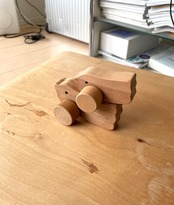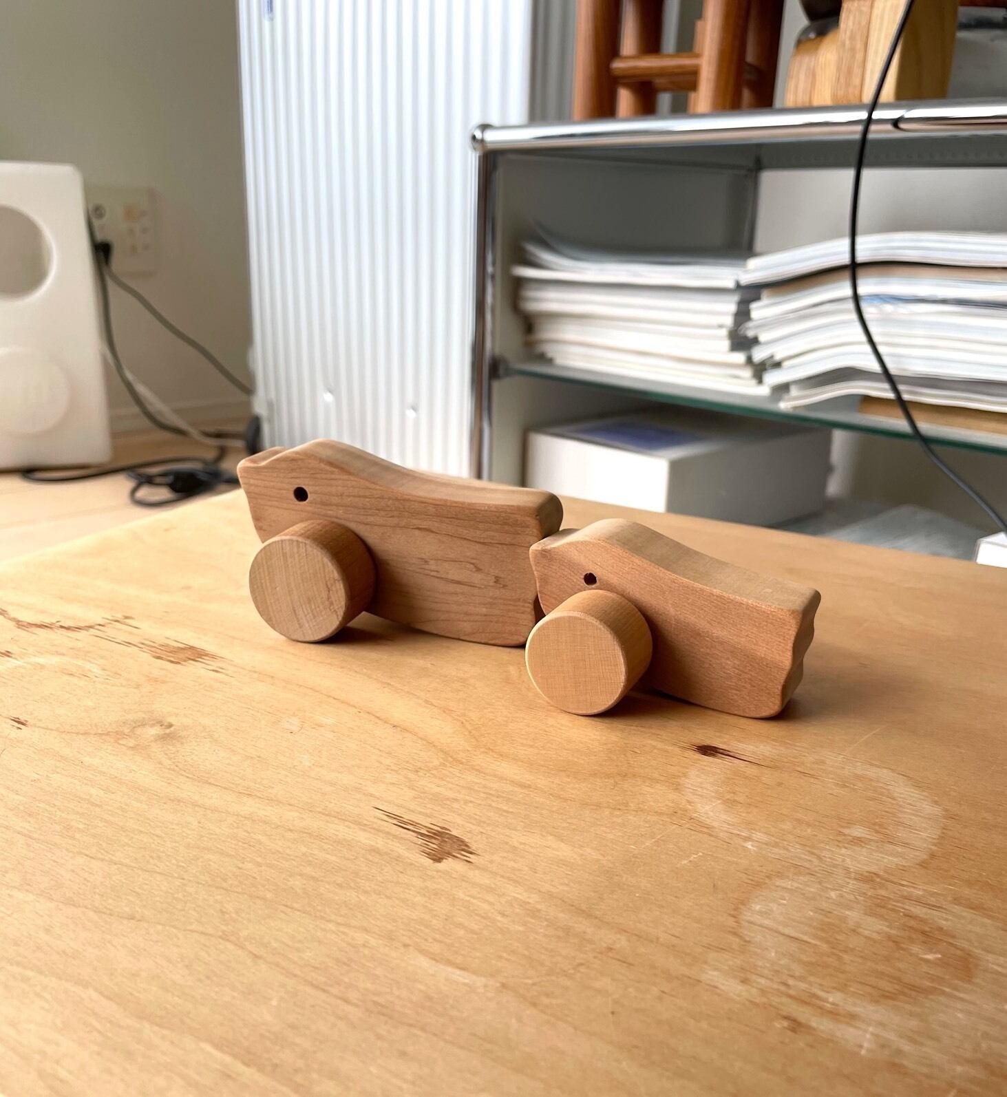 はじめてのぴよぴよは、以前カツラ材で作っていた大きめのブーブー(押しぐるま)のおもちゃ、ぴよぴよブーブーを可愛らしくアレンジして親子のようなセットにしたものです。