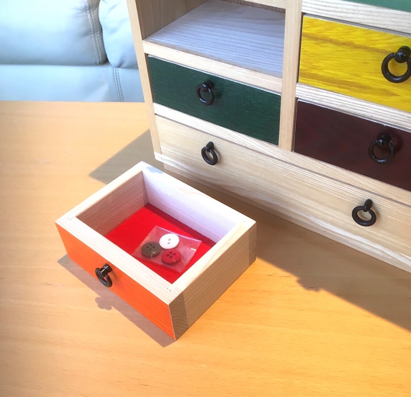 全部で9つのひきだしがあり、一番下のひきだしのみ無色クリアーですが、ハサミや筆記具など文房具を仕舞うのにちょうど良いサイズにしています。
