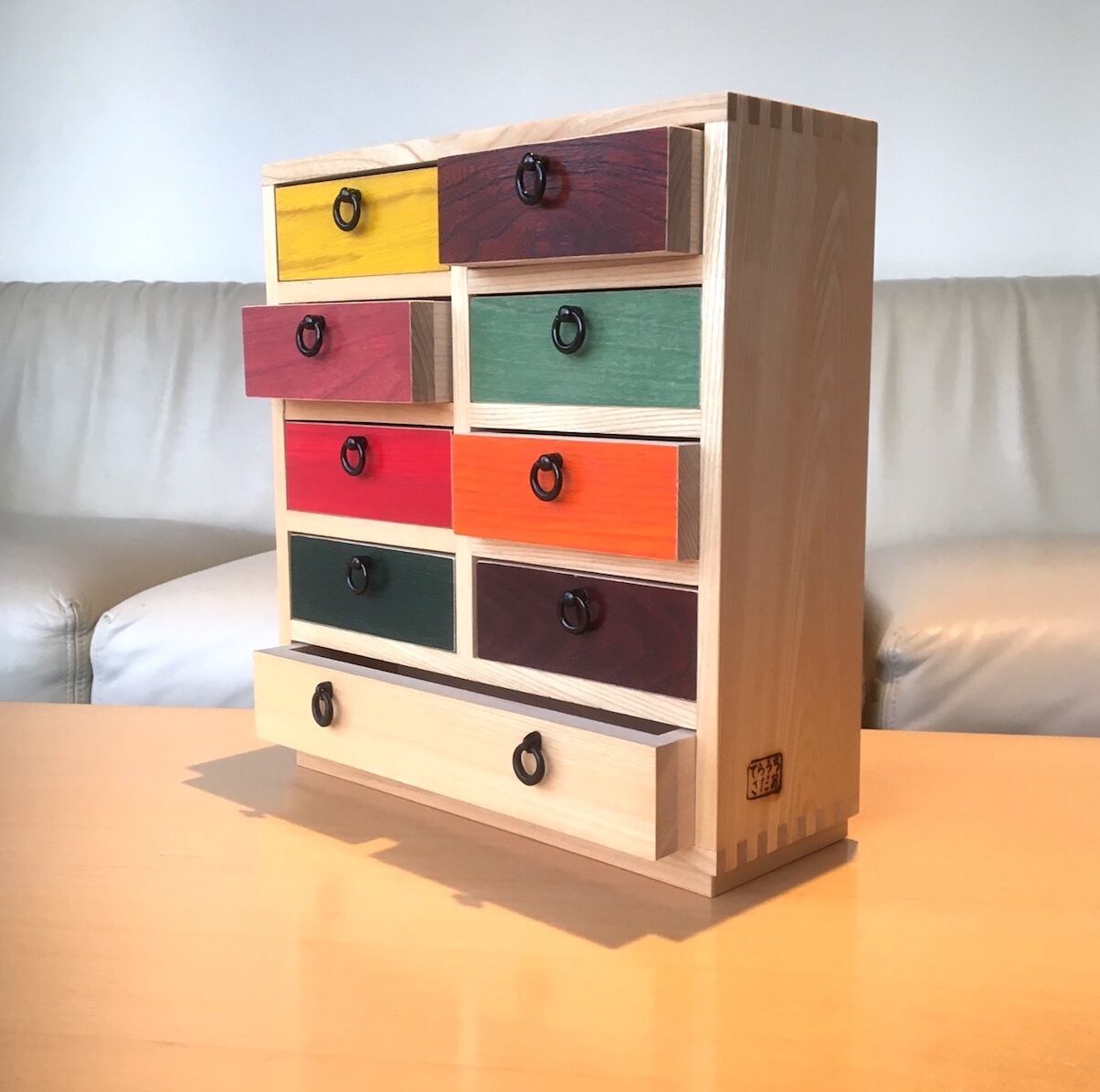 9つのひきだしの無色版デッドストック商品の、ひきだしを色付きに入れ替えて新発売の「9つのひきだし 8カラー」です。