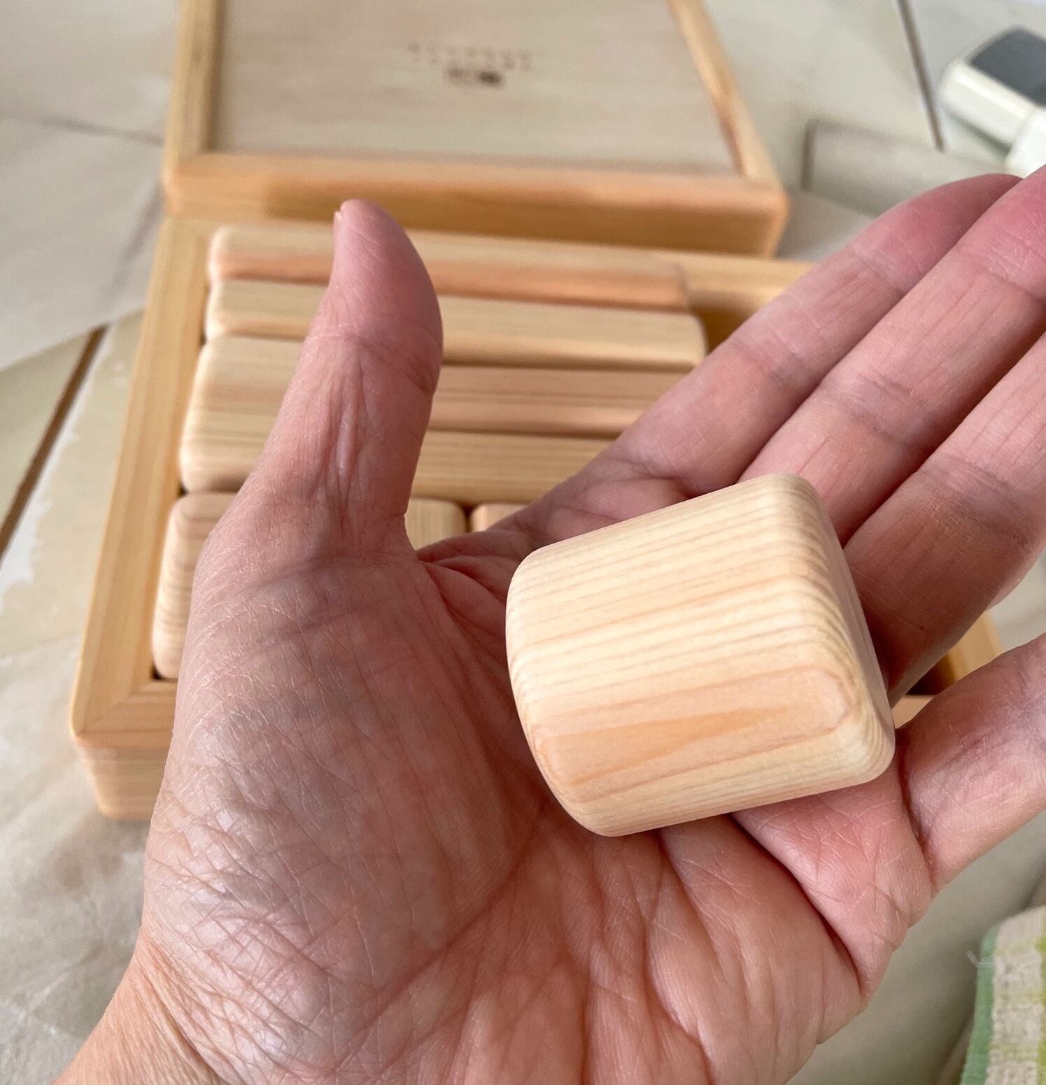 人気の諸戸百年檜の蓋つき箱入りのあかちゃんつみき、アウトレット品です。