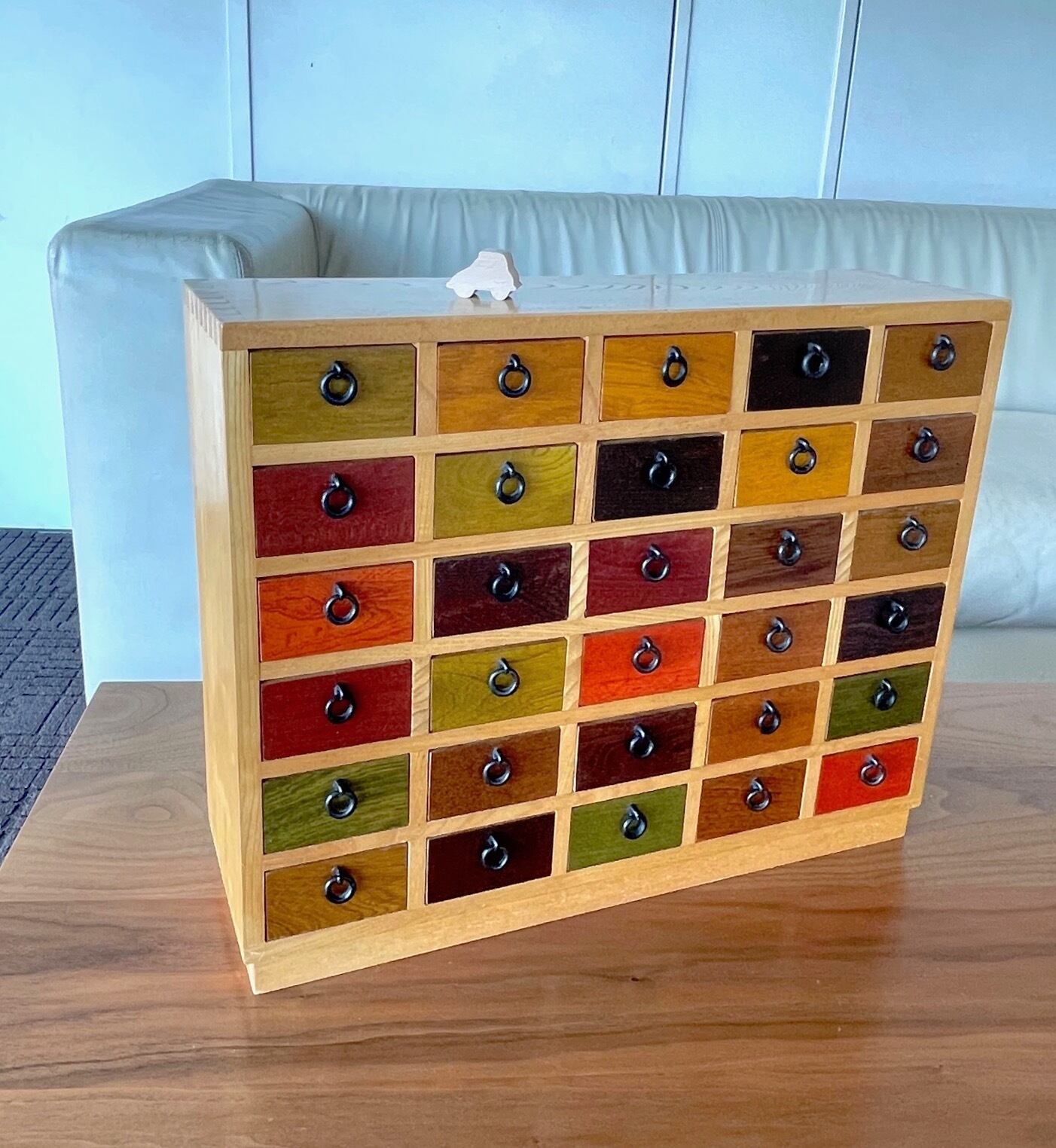 30個の小さなひきだしの前板は、寺内家総出で染色塗装しています。