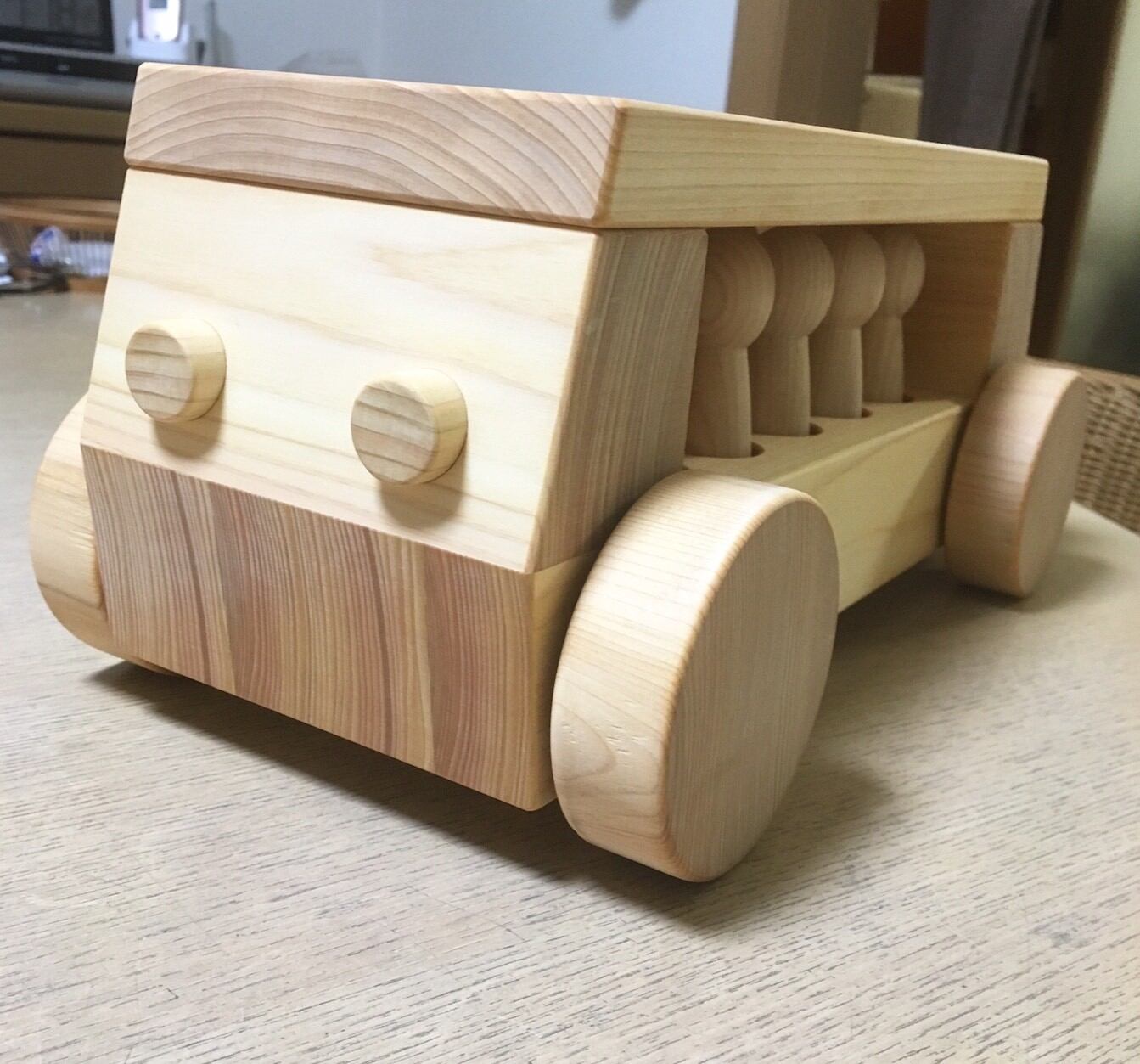 日本の森林認証材にも選ばれている銘木、諸戸林業のヒノキで作った、どっしりとした大きさのバスです。