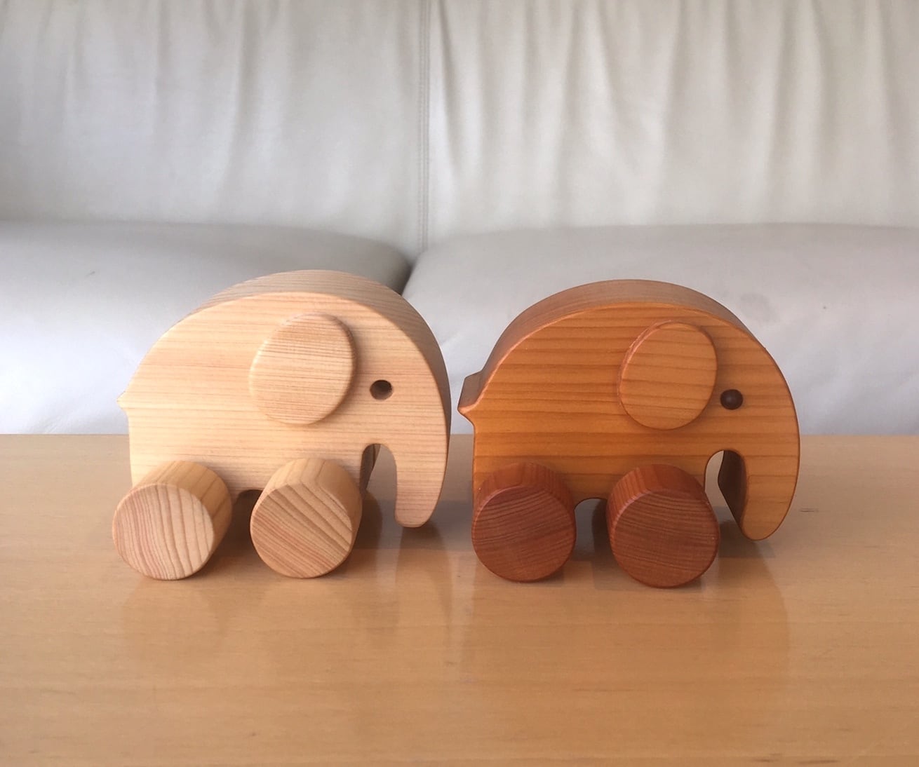 子のゾウ 全長約9.5cm、高さ8cm、厚み4cm。親のゾウの重さ約600g。諸戸百年檜 VATON磨き仕上げ。お米由来のワックスコーティング済み